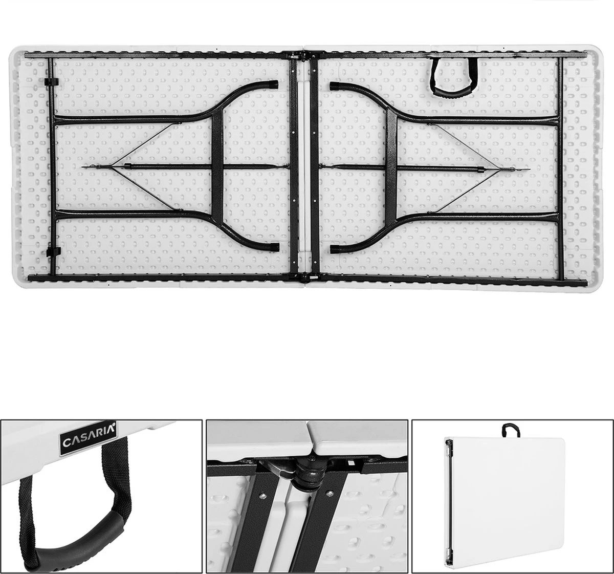 De grote tuintafel van CASARIA kan in een paar stappen eenvoudig worden ingeklapt en heeft een koffervriendelijke pakmaat van slechts 110 cm lang, ideaal om op te bergen als hij niet wordt gebruikt. De campingtafel biedt plaats aan maximaal 10 personen. Het lage draaggewicht en de praktische kofferfunctie met draaggreep maken de eettafel tot de perfecte metgezel in de tuin, op kampeertrips en overal waar een snelle opslag nodig is. De buffettafel is perfect voor buitengebruik dankzij de weerbestendige HDPE-kunststof en het robuuste stalen frame. Het onderhoudsvriendelijke, gladde kunststof oppervlak maakt de buffettafel gemakkelijk en eenvoudig te reinigen. Uitgerust met antislipvoetjes biedt de campingtafel een veilige stand en beschermt hij ook gevoelige oppervlakken.