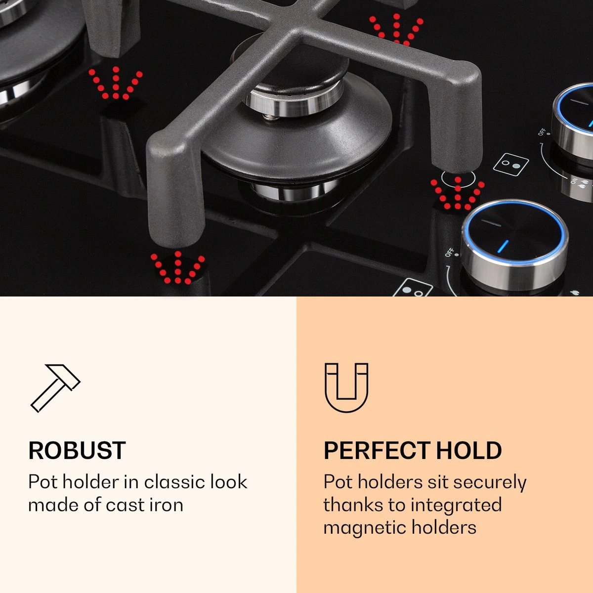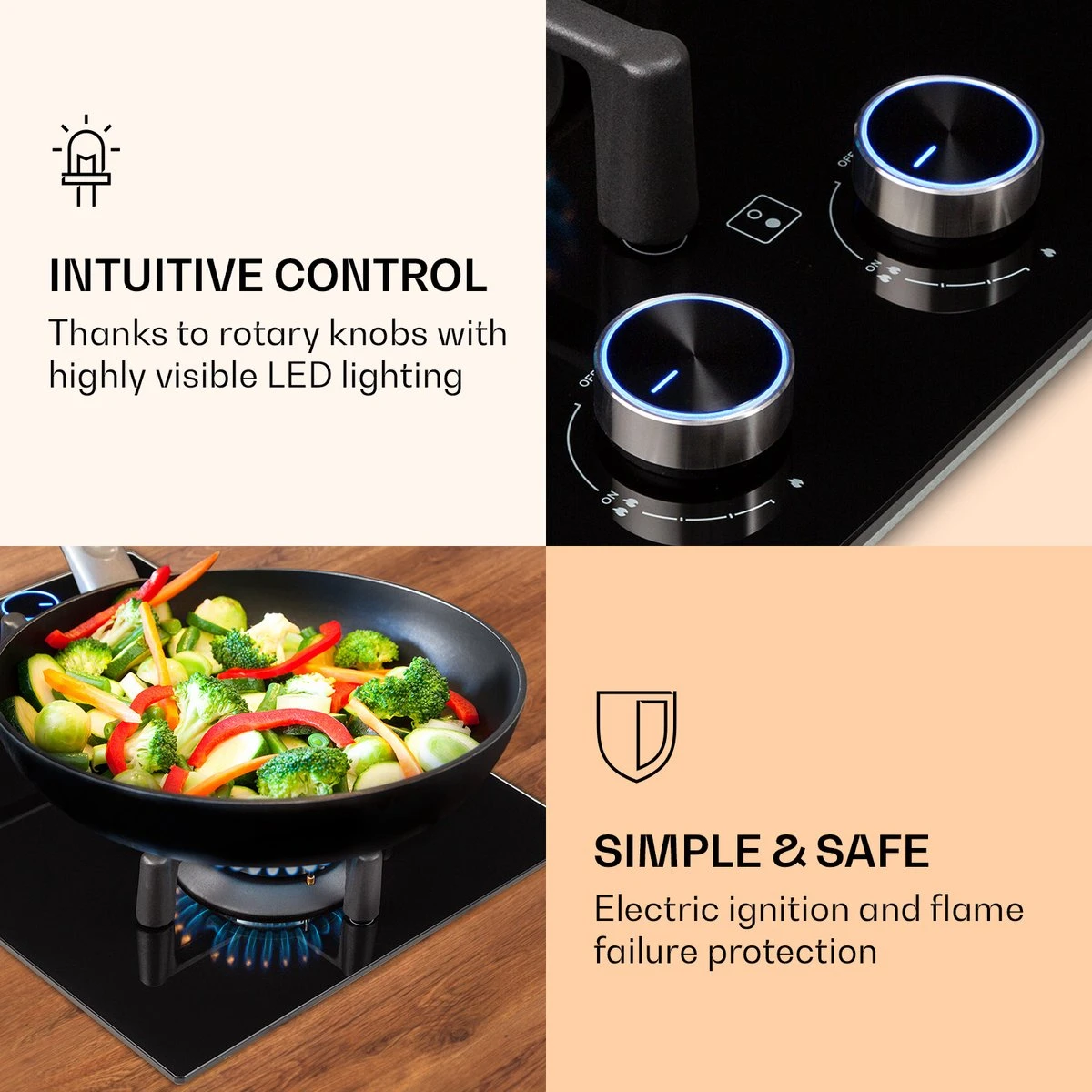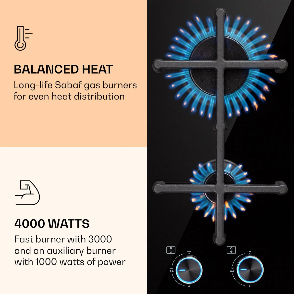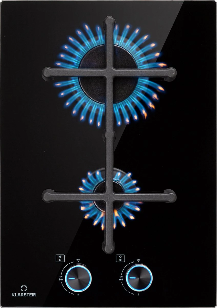 Op de ruimtebesparende Klarstein Illuminosa Domino kookplaat bevinden zich twee hoogwaardige Sabaf branders, die met een totaal vermogen van 4000 watt, 1 x 3000 en 1 x 1000 watt, goed heet worden. Beide branders verdelen de hitte gelijkmatig, zodat alles perfect gaar wordt. Het massieve gietijzeren kruis met ingebouwde magnetische houder ligt precies en stabiel boven de vlammen. Het gebruik is geheel intuïtief dankzij de eenvoudige symbolen en grote, verlichte draaiknoppen. Duidelijk voordeel: De directe regeling van de vlammen heeft weer een direct effect op de hittetoevoer naar de pot of pan. De gasvlam wordt ontstoken via een elektrische ontsteking en de vlamuitvalbeveiliging sluit de gastoevoer naar de brander af wanneer de vlammen, om welke reden dan ook, uitvallen. Na het koken kan de gaskookplaat heel gemakkelijk worden schoongemaakt: Het glaskeramische oppervlak is niet alleen elegant, maar ook uiterst onderhoudsvriendelijk. Efficiënt koken tegen lagere kosten met alle voordelen van de gaskookplaat: De Illuminosa Domino gaskookplaat van Klarstein overtuigt niet alleen amateurkoks.