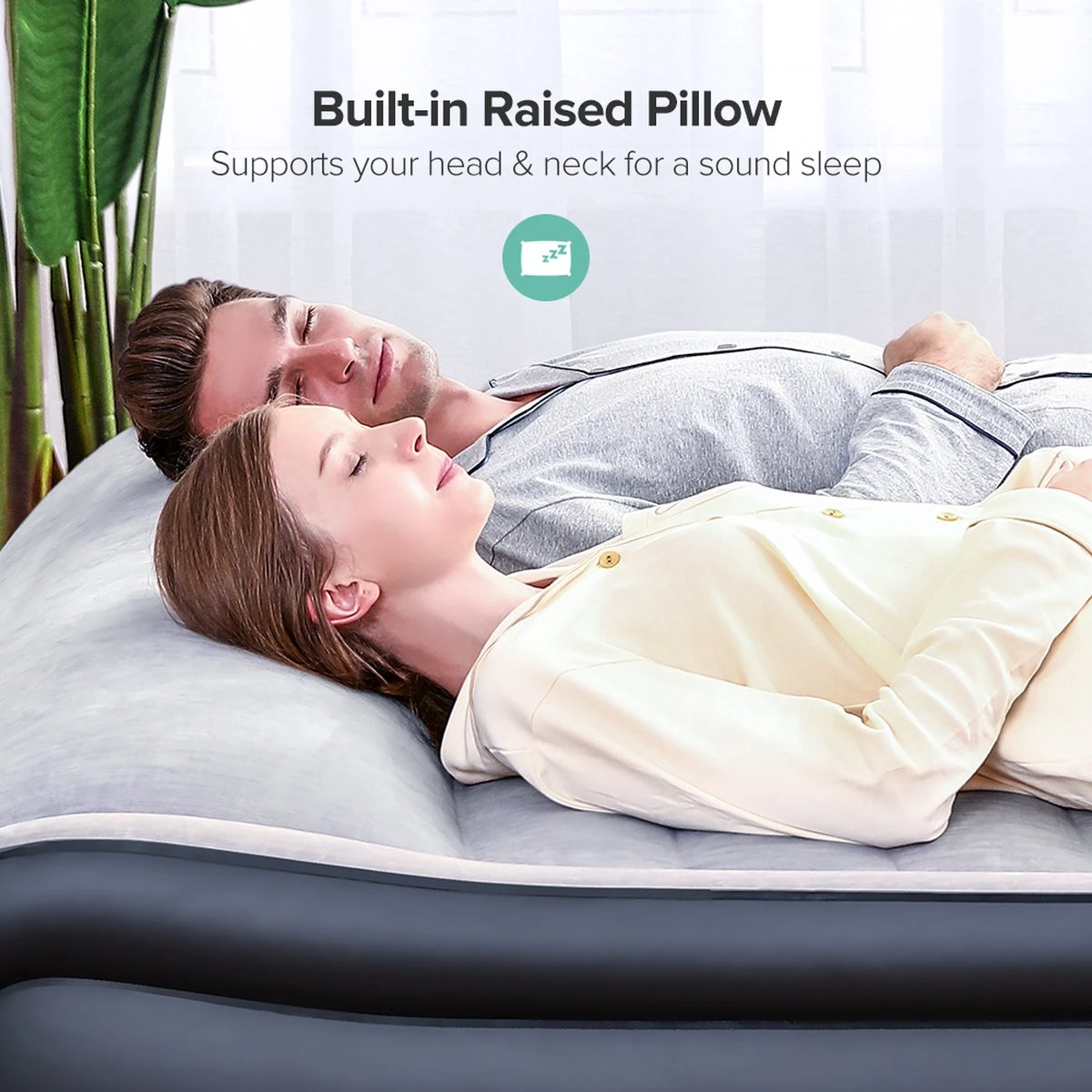 Bovenkant van de opblaasbare matras gaat omhoog als een kussen en biedt ondersteuning voor hoofd en nek voor een onvergetelijke nachtrust
